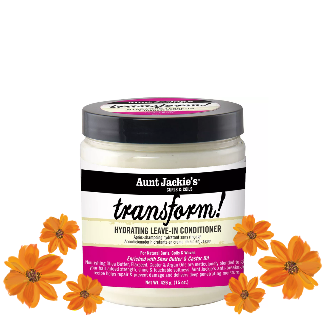 El Acondicionador en Crema Hidratante sin Enjuague TRANSFORM! de Aunt Jackie le da al cabello seco una renovación hidratante. Después de un solo uso, notarás que tu cabello luce más vibrante, se siente más suave, mejor hidratado y más manejable. Enriquecido con aceites de linaza y ricino de penetración profunda para ayudar a detener el debilitamiento y la caída, aceite de argán para mejorar la fuerza y el brillo, y manteca de karité para la suavidad, TRANSFORM! se puede usar en todo tipo de cabello y texturas como un eficaz acondicionador sin enjuague.