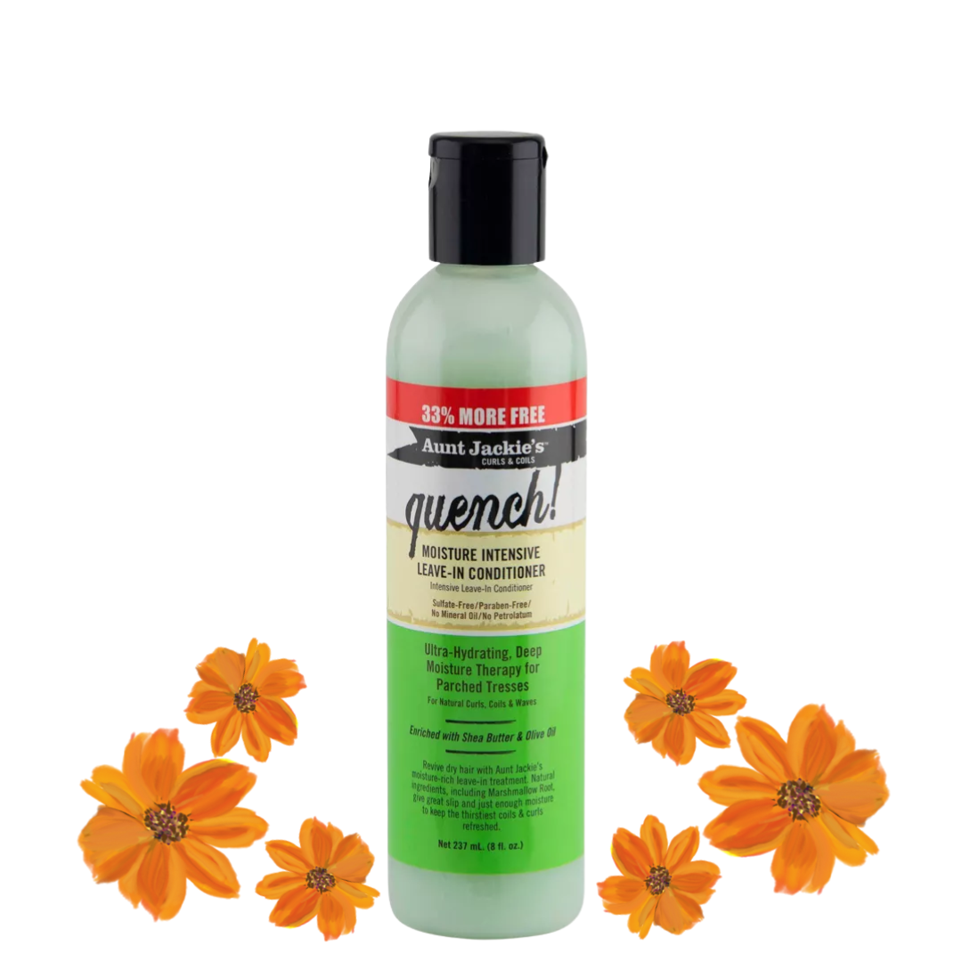 Este tratamiento súper hidratante y acondicionador ayuda a eliminar la sequedad sin dejar una sensación pesada. ¿Qué le hará a mi cabello? ¡Ahhh! Ese es el sonido que hace tu cabello al exhalar después de absorber el Acondicionador Sin Enjuague Aunt Jackie's Quench! Hidratación, suavidad y suavidad duraderas gracias a acondicionadores naturales como raíz de malvavisco, manteca de karité y aceite de oliva virgen extra. ¡No lo enjuagues! Este tratamiento súper hidratante y acondicionador ayuda a eliminar la sequedad sin dejar una sensación pesada.